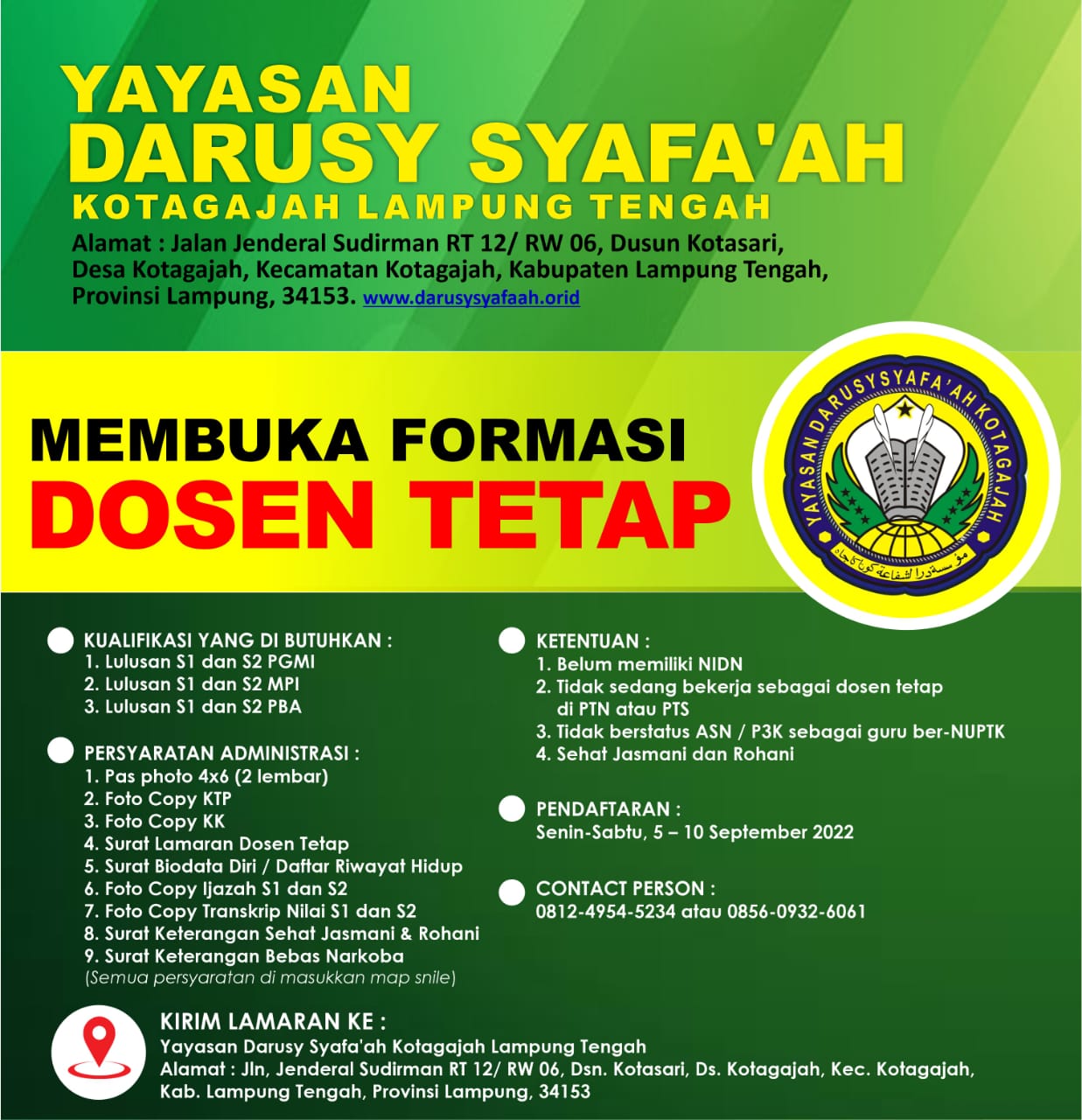 Lampung Tengah - Tahun 2022 ini STIS Darusy Syafaah kembali membuka kesempatan bagi para lulusan sarjana S1 dan S2 untuk bergabung sebagai dosen tetap. Kesempatan pengajuan lamaran dibuka mulai Senin hingga Sabtu (5-10 September 2022).